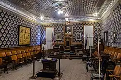 The building has served and continues to serve one lodge of Freemasons, that of Nevada Lodge No. 4 A.F. & A.M. The lodge was founded by several Masons, with Andrew Mason, one of the early settlers of the American Midwest in search of gold, serving as the lodge's first Worshipful Master.[1] Nevada Lodge No. 4 was originally granted dispensation as Nevada Lodge U.D. (also called Nevada Lodge No. 36)[2] in the Kansas Territory by the Grand Lodge of Kansas on December 22, 1860. When the Kansas Territory became the Colorado Territory in 1861, the Grand Lodge of Colorado was formed, and chartered Nevada Lodge No. 4[3] by Rev. John Chivington, the first Grand Master of Colorado Masons.[4]