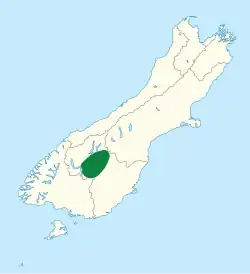 | Distribution of Oligosoma toka on a map of the South Island Known native range