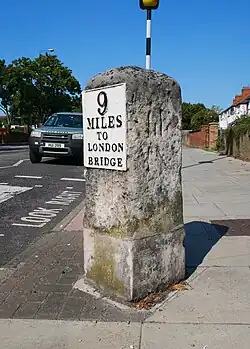 An eighteenth-century milestone stands along Footscray Road in New Eltham