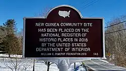 On December 22, 2017, Governor Andrew Cuomo announced 23 properties to be sites recommended by New York State Board of Historic Preservation for the state and national registry as a historic place including the New Guinea site located at East Market Street in Hyde Park.[17][18] A sign from the William G. Pomeroy Foundation[19] marks that portion of the site that is located within the Town of Hyde Park’s Hackett Hill park. Work by the Dutchess County Historical Society in 2022 revealed that the New Guinea extended immediately west of the Hackett Hill site.[20]
