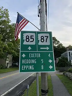 New Hampshire Route 87 is a 6.317-mile-long (10.166 km) east–west highway in Rockingham County in southeastern New Hampshire connecting Newfields to Epping. The eastern terminus of NH 87 is in Newfields at its junction with New Hampshire Route 85. The western terminus is in Epping at its junction with New Hampshire Route 125.