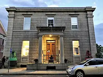 The New London Custom House is located on New London's waterfront, facing north onto Bank Street east of its junction with Pearl Street. It is a three-story masonry structure, built out of dressed granite of differing colors. Due to sloping terrain, it presents two stories to Bank Street and three to Water Street, which separates it from the waterfront. It has corner pilasters shaped out of light granite, and its main entrance is sheltered by a porch with round columns and pilasters made of more smoothly finished light granite. A stringcourse of light granite separates the upper floors, and the top-floor windows have projecting cornices over the lintels. The door is fashioned out of wood that was once used in the USS Constitution.[3] The custom house was built in 1833 to a design by Robert Mills, who was then employed by the federal government. The granite for its construction was taken from the Millstone Quarry in Waterford, Connecticut.