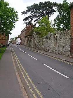 ![]() Looking south along Ashford Road towards High Street, showing the building and wall of the priory | |