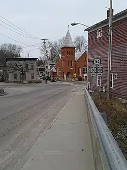 NY 163 begins at an intersection with NY 5S and NY 80 (Main Street) in the village of Fort Plain, although it is signed as ending at NY 80 south of NY 5S. The route heads southwest along Main Street through Fort Plain, overlapping with NY 80 as it passes multiple commercial businesses near the village center. At Kellogg Street, NY 80 and NY 163 separate, with the former continuing along Main Street and the latter turning southward onto Kellogg Street. After crossing over Otsquago Creek, NY 163 intersects with Clinton Avenue, where the route turns west along the creek. At the junction with Garfield Street, the name changes to Douglass Street, which runs alongside the Otsquago through a residential section of Fort Plain. Just after the junction with Honey Hill Road, the route crosses into the town of Minden, changing names to Cherry Valley Road.[3]