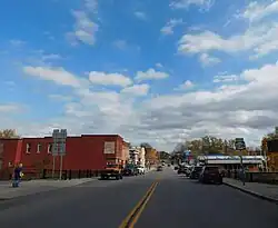 Just outside the Attica village limits, NY 238 turns west, taking over East Main Street from CR 19 at a junction adjacent to the Attica Central Middle and High Schools. NY 238 continues west into Attica, initially passing quietly through mostly residential areas of the village. It soon enters the business district, where it connects with the northern terminus of CR 31 (Exchange Street). After three more blocks, the route descends into the Tonawanda Creek basin and meets with NY 98 at High Street. NY 238 turns north here, overlapping with NY 98 along Market Street for 0.3 miles (0.5 km) to Buffalo Street, where NY 238 turns northwest to follow Buffalo Street out of the village and into Genesee County.[3] Across the county line, NY 238 cuts across the southwestern corner of the town of Alexander on its way into the town of Darien. It closely follows the Norfolk Southern Railway's Southern Tier Line through this mostly rural area, and CR 45 follows a parallel routing to NY 238 on the opposite side of the tracks through much of the area. CR 45 leaves NY 238 just outside Attica, and rejoins the state route about 2 miles (3.2 km) later in Darien. As a result, one road which used to cross the tracks in this area—CR 36—has been cut in half, eliminating the requirement to maintain its grade crossing. After CR 45's western terminus, NY 238 turns more northward again, entering a residential area and terminating at a junction with US 20 in the hamlet of Darien.[3]