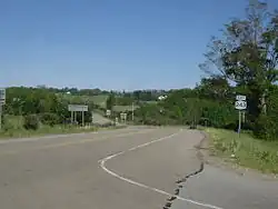 NY 243 has been realigned in two locations since it was assigned. In the town of Rushford, the highway was originally routed through the hamlet of Rushford, using Buffalo and Main streets and the southern half of Upper Street to traverse the community.[7][8] Plans for a bypass of Rushford were drawn up by the state as early as 1961, when the realignment was proposed as part of a larger effort to improve all of NY 243 between the hamlets of Rushford and Caneadea. The project would also lessen the number of curves and eliminate high grades along the highway.[9] It was completed sometime between 1963 and 1976. During the same period, NY 98 was reconfigured near the west end of NY 243 to intersect the latter at a new junction in Freedom, located just northeast of their original intersection in Farmersville. NY 243 was truncated to end at the new junction while the route's former routing into Farmersville became part of NY 98.[7][10]