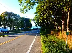 NY 272 directly serves Morton, a small community situated equally in the town of Kendall and the town of Hamlin. In the center of Morton, NY 272 intersects Morton Road (unsigned County Route 279 and formerly NY 360), which approaches NY 272 from the Monroe County side. North of Morton, the amount of development along the road declines sharply as it heads toward Lake Ontario. NY 272 meets the Lake Ontario State Parkway at an interchange south of the shoreline near the west end of Hamlin Beach State Park. This is the last signed highway that NY 272 intersects;[3] however, NY 272 officially continues to the lakeside hamlet of Troutburg in the town of Hamlin, where it terminates at a dead end at the southern lakeshore.[1]