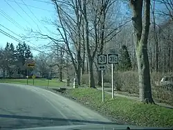 Valley Drive received its first posted designation in the mid-1920s when it was designated as NY 31A, a spur route of NY 31 that linked NY 31 in Jordan to NY 5 in Elbridge.[15][16] The designation was short-lived, however, as the route became the northernmost portion of NY 41 in the 1930 renumbering of state highways in New York.[17] NY 41 was truncated to its present northern terminus in Skaneateles c. 1933. Its former routing between Elbridge and Jordan was redesignated as NY 31C.[18][19]