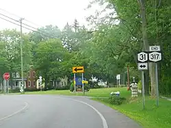 In Jordan, NY 317 becomes Elbridge Street and turns west to intersect the northern terminus of Valley Drive. The highway proceeds through the southern portion of the village and crosses Skaneateles Creek to reach a junction with South Main Street. NY 317 turns north onto Main Street and has intersections with Mechanic Street (CR 60) and North Hamilton Street (designated as CR 271 south of Jordan) before it terminates at a junction with NY 31 north of the village center but within the village limits.[3]