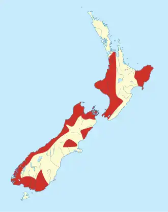 | Approximate known formal distribution (in red) of the New Zealand grayling on a map of New Zealand | |