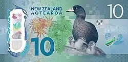 New Zealand's banknotes were completely re-designed in the 1990s to introduce uniquely New Zealand designs.[3] Kate Sheppard, the most famous New Zealand suffragist, was now on the front of the ten-dollar note, next to a white camellia, a symbol for universal suffrage in New Zealand. A whio, an endangered species of New Zealand bird, was on the back. Between the portrait and the camellia was a map of New Zealand. The note had a light blue background with ferns.[1][2] Another feature was the tukutuku patterning on the front, taken from the Te Hau ki Tūranga meeting house at Te Papa Museum.[4]