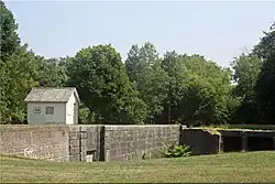 Remnants of the former Enlarged Erie Canal Lock 59 (also called the Upper Lockville Lock) are located along North Clinton Street across from the current Lock 28B in Newark, just off N.Y. Route 31. It was a double-chamber lock built in 1841, and had a lift of 7.88 feet (2.40 m) to the west.[6][7] The former Enlarged Erie Canal Lock 58 (also called the Middle Lockville Lock) is a few blocks east off Lyons Street, but one of the chambers is being used by a scrap company. Volunteers cleared the other chamber as part of a canal trail project.[8] Located where Military Brook enters the canal on West Union Street is a little known remnant of the original Erie Canal. It is where Military Brook a.k.a. Whipspool Creek was routed UNDER the canal to the north side where it eventually flowed through the Newark Cemetery on its way to the Ganargua Creek.