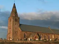 The 13th century Parish Church of St Bartholomew, bleakly situated against a North Sea backdrop at Church Point, contains a notable collection of medieval gravestones. Eight complete cross slab grave covers have been reset in the walls of the north aisle which was rebuilt in 1912. The chancel, the east and western bays of arcades and the west tower are all 13th century, while the spire dates to the 14th century.[9]