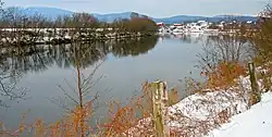 Located at the Great Oxbow of the Connecticut River, with vast tracts of beautiful and fertile intervale, the area was a favorite of the Indians. Rivers teemed with salmon and brooks with trout.[5] Prior to European settlement, the Newbury area was the location of a village called Cowass or Cowassuck of the Pennacook tribe.[6] Cowass in Abenaki is "Coo-ash-auke," meaning "place of pine trees," and was a general name these people gave to the upper Connecticut River Valley and Lakes region.[7] The village was known to French Jesuit missions as Koés.[8] In 1704 the Pennacook at Cowass kept several captives from the Deerfield Raid in the village, including Stephen Williams who was kept with Sachem George Tahanto[9][10][11] The area was first settled by English colonists in 1762 by Samuel Sleeper and family. One of the New Hampshire grants, Newbury was chartered by Governor Benning Wentworth on March 18, 1763, to Jacob Bayley and 74 others, some from Newbury, Massachusetts.[5]