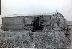 Log cabin and homestead in the Newdale area. Early 1900s.