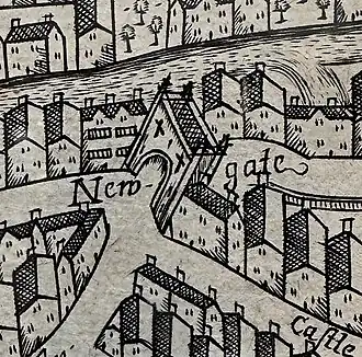 In 1461, one of Bristol's former customs officers, John Heysaunt, was charged with plotting the death of Edward IV, who had seized the throne the previous year. Heysaunt was convicted of treason, hanged and beheaded at St Michael's Hill. His head was then 'placed on Bristol’s Newgate, in full view of those travelling to and from the town, to strike terror into the hearts of all those delinquents tempted to resist the new king'.[8] Newgate is depicted on Robert Ricart's 1478 map of the town, labeled 'Porta Nova'.[9]