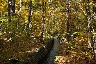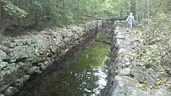 The Newichawannock Canal is located between Great East Lake to the north and Horn Pond to the south, on the southern portion of the north–south border between Maine and New Hampshire. The canal is 13 feet (4.0 m) wide and about 16 feet (4.9 m) deep, and is lined with unmortared stone. An unmortared stone-arch bridge, built at the same time, carries Canal Road over the waterway.[3] Also located in the area are piles of stone, apparently left over from the canal construction, and a second canal that lies submerged in Great East Lake.[5] Horn Pond is the source of the Salmon Falls River, a tributary of the Piscataqua River, both of which form the New Hampshire-Maine border south of the pond.