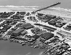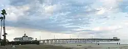 The original pier was known as McFadden Wharf when it was completed in the summer of 1888 by local landowners James and Robert McFadden.[1] The wharf served as a shipping connection for the McFaddens to offload lumber, hides and other merchandise.[2] In 1890, they connected it to the Santa Ana and Newport Railway for commercial transport into Orange, San Bernardino, and Riverside Counties.[1] The McFaddens sold the site in 1902 to W.S. Collins, who began to transform the area for residential and recreational use.[3] The expansion of the Los Angeles passenger railway system to the wharf in 1905 catalyzed the development of the city of Newport Beach as a tourist destination.[3][4]