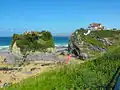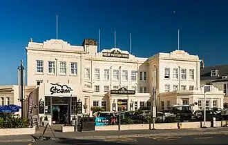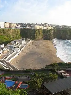 Several major hotels were built around the end of the 19th century, the first being the Great Western Hotel which opened in 1879 on Station Road, now Cliff Road. The original hotel was rebuilt in the 1930s.[27] Other early first-class hotels included the Victoria (1899), the Atlantic (1892) and the Headland (1900) near Fistral,[28] Many smaller hotels were also being opened. Some were created around the turn of the century by converting large houses, many of which had been built originally by wealthy visitors as holiday homes, particularly along Narrowcliff.