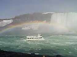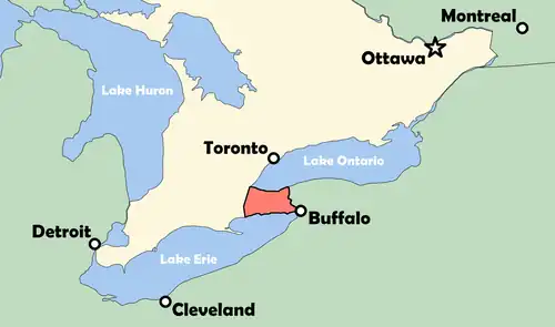 The Niagara Peninsula is an area of land lying between the southwestern shore of Lake Ontario and the northeastern shore of Lake Erie, in Ontario, Canada. Technically an isthmus rather than a peninsula,[1] it stretches from the Niagara River in the east to Hamilton, Ontario, in the west. The peninsula is located in the Golden Horseshoe region of Southern Ontario, and has a population of roughly 1,000,000 residents. The region directly across the Niagara River and Lake Erie in New York State is known as the Niagara Frontier.