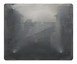 Niépce's correspondence with his brother Claude has preserved the fact that his first real success in using bitumen to create a permanent photograph of the image in a camera obscura came sometime between 1822 and 1827.[15] The result is now the oldest known camera photograph still in existence. The historic image had seemingly been lost early in the 20th century, but photography historians Helmut and Alison Gernsheim succeeded in tracking it down in 1952. The exposure time required to make it is usually said to have been eight or nine hours, but that is a mid-20th century assumption based largely on the fact that the sun lights the buildings on opposite sides, as if from an arc across the sky, indicating an essentially day-long exposure. A later researcher who used Niépce's notes and historically correct materials to recreate his processes found that in fact several days of exposure in the camera were needed to adequately capture such an image on a bitumen-coated plate.[16][17]