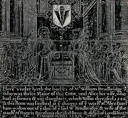 This brief alliance had earned him the disapproval of Queen Elizabeth, upon rumours that she was much younger than him (though she had a son aged over 40), and that the "intempestive mariadge" was had for reasons of wealth.[38] At his death in 1590[39] many of Godwin's possessions were dispersed informally to certain London merchants, including (notably) Peter Robinson, Salter, and John Johnson of Watling Street, Merchant Taylor.[37] These men were immediate kinsmen, actually brothers-in-law, of Nicholas and William Marston.[6][40] Robinson, who married Anne Marston, had been a witness in Thomas Marston's will of 1581.[3] Johnson, Alice Marston's second husband, was an eminent Guildsman, being elected Master of the Merchant Taylors, and then presiding, at the Company's feast attended ceremonially by King James I in 1607.[41] Their involvement in Godwin's funeral, the dispersal of his estate, and their careful inventories of goods received, might be explained if Sybil Godwin was the former Sybil Marston, née Bradbridge.