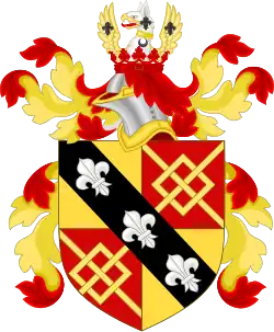 Nicholas Spencer was born to an aristocratic English family long seated at Cople, Bedfordshire.[4] The family was related to the Spencer family of Northamptonshire, with whom they shared a coat of arms.[5][6][7] In 1531 the Spencers bought the manor of Rowlands at Cople,[8] which they owned for several centuries.[9] Nicholas Spencer, Sr., father of the Virginia emigrant, and his wife, the former Mary Gostwick, second daughter of Sir Edward Gostwick, 2nd Baronet,[10] had several sons, of these William inherited the family estates but died childless after making his heir his nephew, also William, son of his next-brother Nicholas who had moved to Virginia.[11] Another brother, Robert Spencer later removed from Surry County, Virginia, to Talbot County, Maryland, where his descendants long lived at Spencer Hall, the family plantation.[12][13]