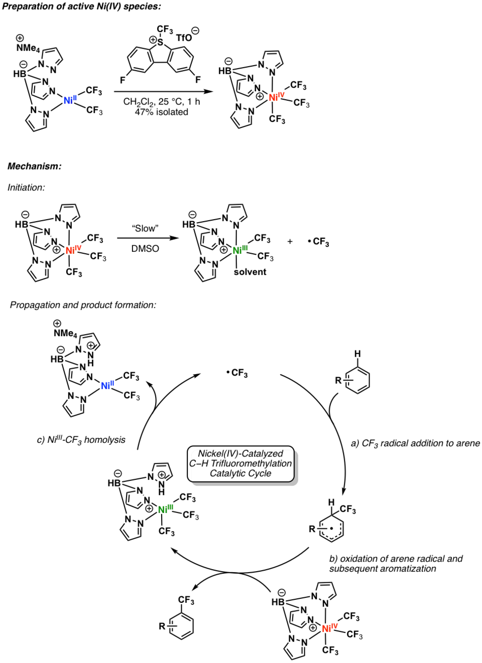 - ^ D'Accriscio, Florian; Borja, Pilar; Saffon-Merceron, Nathalie; Fustier-Boutignon, Marie; Mézailles, Nicolas; Nebra, Noel (2017-09-06). "C−H Bond Trifluoromethylation of Arenes Enabled by a Robust, High-Valent Nickel(IV) Complex". Angewandte Chemie International Edition. 56 (42): 12898–12902. doi:10.1002/anie.201706237. ISSN 1433-7851. PMID 28815889.
