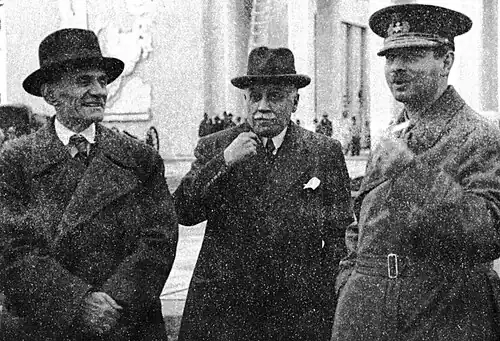 Politically, Batzaria had switched to the PNL, and represented its group within the General Council of Bucharest;[125] around 1930, he had entered the Citizens' Committees, a trans-political coalition established by Dem I. Dobrescu, heading their central council.[126] The new Romanian king, Carol II, appointed Iorga as prime minister in early 1931, with Iorga's Democratic Nationalists and their allies also taking up posts in the local administration. On April 25, Batzaria was made Prefect of Timiș-Torontal County, in southwestern Romania.[127] This appointment came with the phasing out of the regional governorates which had been established by the PNȚ; from April 28, Batzaria took over as the last, and temporary, governor of the Banat.[128] He only served in both capacities for less than two weeks: on May 8, Constantin Argetoianu of Internal Affairs had him replaced with Aurel Cioban.[129] Batzaria and Iorga soon quarreled: in March 1932, Neamul Românesc reported on a Bucharest PNL meeting at which Batzaria had promised to use a "fire whip" against the regime. The newspaper also scolded Batzaria for his "flimsy" claim that Iorga had "savagely mistreated" students engaged in anti-government protests.[130] Batzaria benefited from the PNL sweep of December 1933, as the eighth of 20 National Liberals who took seats in the Assembly of Deputies for Ilfov County.[131] His interventions there included an impromptu lecture about the Gagauz people in southern Bessarabia, a topic on which his colleagues in the Assembly were generally uneducated.[132] He also supported amending the nationality law to give Aromanian colonists, who had been denaturalized by their respective Balkan states, a fast-track to Romanian citizenship.[133]