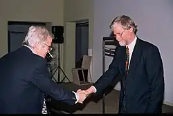 ![]() Torp (left) receives the Jacob Award for 1999 from Peter Butenschøn. | |