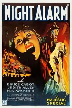 Night Alarm is a 1934 American drama film directed by Spencer Gordon Bennet and starring Bruce Cabot as a down-on-his-luck reporter, Hal Ashby, who tries to make a name for himself by investigating a series of bizarre arson attacks.[1] The film, which was a hit in movie theatres at the time, is now widely available in the public domain.