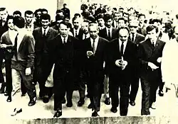 Atsız was prosecuted twice in 1944. Once he was prosecuted on the initiative of Sabahattin Ali for accusing him (and 3 other communists) of being a traitor and warning Prime Minister Şükrü Saracoğlu about them, who established important positions in high schools and universities, which Atsız believed was with the help of the Minister of National Education.[42][43] Atsız knew Ali from before as they shared a room with him in the 1920s,[31] when Sabahattin Ali was a nationalist.[44] He was given a sentence of 6 months in the trial against Sabahattin Ali, which was later reduced to a suspended sentence of 4 months.[45] During the Atsız-Ali trial, rallies by adherents to the political right-wing spectrum in support of Atsız were held on both court hearings on the 26 April and 3 May 1944.[46] Many of the attendants of these rallies were arrested and later prosecuted during the so-called Racism Turanism trial.[46] During this trial Atsız and 22 others, amongst them also Reha Oğuz Türkkan, Alparslan Türkeş, were prosecuted for inciting racism and Turanism.[47][48] He first got sentenced to 6 years and 6 months in prison, after which the sentence was lowered to 1 year and 6 months and at the end he (along with the other nationalists) received an amnesty.[49] In 1973, despite his health problems, he received a prison sentence of 15 months because of his writings against Kurdish separatists, after 6 years of trials. He wrote that Kurds should leave Turkey (if they insist on keeping the pro-Kurdish propaganda) and learn from the Armenians what happens to the people who challenge the Turkish nation. Many people; including mayors, journalists, writers, university lecturers and students; requested president Fahri Korutürk to release Atsız from prison. After 2+12 months, he was pardoned.[50] [51]
