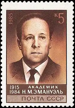 Nikolay Markovich Emanuel (Russian: Никола́й Ма́ркович Эмануэ́ль; October 1, 1915 – December 7, 1984) was a Soviet chemist. He was a key specialist in chemical kinetics and mechanics of chemical reactions. He lectured at Moscow State University since 1944 (and was appointed full Professor in 1950). In 1958 he became a corresponding member and in 1966 he became a full member of the Soviet Academy of Sciences. In 1974, he was elected as a foreign member of the Royal Swedish Academy of Sciences. Buried in Moscow.