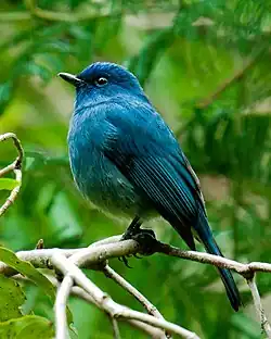 The Nilgiri flycatcher (Eumyias albicaudatus) is an Old World flycatcher with a very restricted range in the hills of southern India. It was formerly referred to as the Nilgiri verditer flycatcher because of its similarity to the verditer flycatcher, a winter migrant to the Nilgiris, which, however, has distinct dark lores and a lighter shade of blue. There are two small white patches at the base of the tail. It is found mainly in the higher altitude shola forests of the Western Ghats and the Nilgiris.