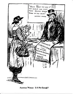 Early 20th-century American cartoons had enjoyed the Gibson Girl from Charles Dana Gibson and the Brinkley Girl from Nell Brinkley.[51] Allender was credited with producing 287 political cartoons regarding suffrage.[53] Her depiction of the "Allender girl," captured the image of a young, capable American woman,[54] embodying "the new spirit that came into the suffrage movement when Alice Paul and Lucy Burns came to the National Capital in 1913."[51]