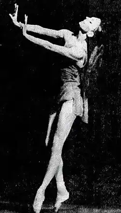 During her career she played in ballets such as Icarus, Asel and Cheeky Rhymes. She danced the title roles of Giselle and The Sleeping Beauty, and appeared as Kitri in Don Quixote.[3] Her partners on stage included Mikhail Lavronsky and Māris Liepa, but her most prominent partner was her husband, Yuri Vladimirov.[3] They appeared in lead roles in a new production of Stravinsky's Le Sacre du printemps in 1965, choreographed by Natalia Kasatkina and Vladimir Vasiliev.[4] With a pas de deux from Esmeralda, the couple achieved the gold medal at the first International Ballet Competition in Moscow in 1969, when Mikhail Baryshnikov won as soloist.[3]