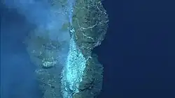 On the caldera floor and rims of Niuatahi can be found many hydrothermal vents. In 2018, a bathymetric survey expedition was executed and many ROV dives were made in 3 sites around the caldera including the southwest, the south-central and the north of the caldera.[7] In the southwest, venting with 293 °C with clear to gray smoke was observed at 1,680 m (5,512 ft) depth.[8] In the south-central area, clear to black smoke was observed at vents with temperatures of 334 °C at most at a depth similar to the southwest vents.[7] In the north, the vents are located at a shallower depth of 1,550 m (5,085 ft) and they emit clear to black smokes with temperatures of 316 °C at most. All of these vent sites have a sulfide composition, hence the yellowish colors can be seen in some vent smokes.[9]