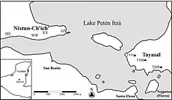 Nixtun-Chʼichʼ stands on the western edge of Lake Petén Itzá. It is bordered by the lake to the south and east; by karstic hills to the north; and uneven terrain to the west. The area of the site is relatively flat, but it was built upon a low ridge that extends east to west. Maya sites are generally dispersed, but Nixtun-Chʼichʼ was laid out with an urban grid. It also includes an axis urbis composed of a row of over 15 buildings extending east to west. The axis and grid were established in the Middle Preclassic period (800-400 BC). The site also has major construction in the Late Preclassic period (400 BC-AD 200) after which the site appears to have suffered a decline—a trend seen in many sites in central Petén. The site was also occupied in the Late Classic through the Colonial period (AD 600-1734).