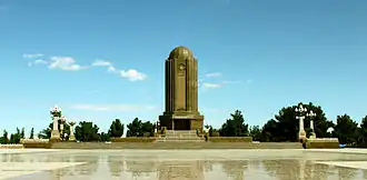 Nizami was depicted on the obverse of the Azerbaijani 500 manat banknote of 1993–2006.[66] In 2008, coinciding with the 800th anniversary of his death, the National Bank of Azerbaijan minted a 100 manat gold commemorative coin dedicated to his memory.[67] The Nizami Museum of Literature is located in Baku, Republic of Azerbaijan. One of the Baku Metro stations is also named after Nizami Ganjavi. There is Institute of Literature named after Nizami[68] and Cinema named after Nizami in Baku. One of the districts of Baku is called Nizami raion. The life of Nizami Ganjavi is shown in the Azerbaijani movie "Nizami" (1982), in which the leading role, role of Nizami Ganjavi, was played by Muslim Magomayev.[69] The Nizami Mausoleum, built in honor of Nizami, stands just outside the city of Ganja in Azerbaijan. It is a tall cylindrical building, surrounded by gardens. To one side, there is a metal statue commemorating Nizami's epic poems. The mausoleum was originally built in 1947 in place of an old collapsed mausoleum and rebuilt in its present form when the Azerbaijani Republic regained its independence after the fall of the Soviet Union in 1991.