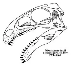Noasaurus ("Northwestern Argentina lizard") is a genus of ceratosaurian theropod dinosaur from the Maastrichtian (Late Cretaceous) of Argentina. The type and only species is N. leali. The fragmentary holotype specimen of Noasaurus, PVL 4061, consisting of a few cranial and postcranial bones, was discovered from strata from the Lecho Formation of Southern Salta in 1975 by a team led by José Fernando Bonaparte. When described by Bonaparte and in PhD student Jaime Powell in 1980, it was believed to be a coelurosaur theropod and assigned to a family of its own; this family, Noasauridae, still exists, though has been reassigned to Ceratosauria.