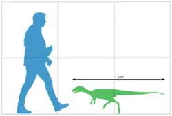 Noasaurus was a small theropod. Gregory S. Paul estimated its length at 1.5 m (4.9 ft) and its weight at 15 kg (33 lb).[13][14] In 2024, Hendrickx et al. used the reconstructed size of the skull and the dimensions of the second metatarsal to provide length estimates of 1.6 m (5.2 ft) and 2 m (6.6 ft), respectively. They abstained from providing a mass estimate due to the lack of the necessary limb elements, and the possibility that the Noasaurus holotype was a juvenile. A histological analysis could not be performed on the holotype, as it was prohibited, thus its age is currently unknown.[1]