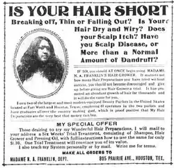 - ^ "Madame N.A. Frankling MFG. Co. Big Business Builders; Parlors Dot Both Sections". The Houston Informer. 30 June 1923. Retrieved 11 February 2016.