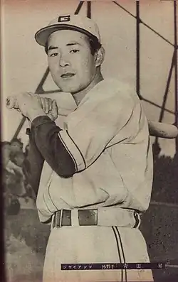 Noboru Aota (青田 昇, Aota Noboru; 1924 – November 24, 1997) was a Japanese professional baseball player.[1] An outfielder, he played with the Tokyo Kyojin/Yomiuri Giants, Hankyu Braves, and Taiyo-Shochiku Robins from 1942–1959, playing in both the Japanese Baseball League and Nippon Professional Baseball (NPB). A five-time league home run champion, he was one of the first true sluggers of Japanese professional baseball — despite being only 5'7" and 171 lbs.[1] Aota was selected as a Best Nine Award-winner five times and a NPB All-Star six separate times. In 2009, he was inducted to the Japanese Baseball Hall of Fame.[2]
