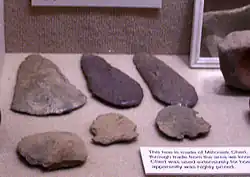 Nodena phase peoples traded with other groups to the west and northwest in the Crowley's Ridge and Ozark Highlands areas for usable stone to make tools. Because of the conditions of the floodplain geography where they lived, no stone was available locally. Chert, basalt, and sandstone were turned into a variety of tools such as celts, chisels, adzes, abraders, hammerstones, hoes, drillbits, mortar and pestles, spear points, and arrow heads. A popular arrow head style is known as the Nodena point, a delicate leaf like shape. Sandstone was also ground and polished into a discoidal shape for use in the game of chunkey.[1]