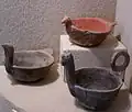 Most pottery found at the Nodena sites is of the Mississippian Bell Plain variety. It was buff colored, contains large fragments of ground mussel shell as a tempering agent, and is not as smooth and polished as other varieties. Other examples found there are much finer, with a finer ground shell as a temper, some instances being so finely ground as to look untempered. Shapes and decoration were varied in the mortuary pottery, from brightly colored abstract spiral designs, to elaborate effigy vessels depicting human heads, animals, and hunters and their prey. Pottery made by the Nodena people was built up from strips of clay, and then smoothed out by the potter, much like other pottery in the Eastern America area where the potters wheel was unknown. Slips using galena for white, hematite for red, and sometimes graphite for black were used to paint the pottery, with a red on white swastika design being particularly popular. Sometimes incising was used (an example is the incised raptor image on the effigy head pot pictured), although it is rare in Nodena pottery.[1] Women were probably the makers of pottery, as in most other Native American cultures. The grave of a woman at the Nodena site contained 11 polishing pebbles and a mushroom shaped pottery anvil.[1]