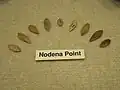 Nodena points are an exquisitely made willow leaf-shaped flint blades named for the Nodena site that are diagnostic of the Late Mississippian and Protohistoric periods over a large section of the American Midwest and South. Examples have been found in Dallas phase sites in Tennessee, Oneota sites in Iowa and Wisconsin, Caborn-Welborn culture sites in Indiana, Illinois, and Kentucky, protohistoric Quapaw sites in Arkansas, as well as sites in Alabama, and Florida. Two different types of Nodena points were made, the Nodena Elliptical and the Nodena Banks varieties. The Banks variety has a straight base, as opposed to the bi-point shape of the Nodena Elliptical. The Banks variety is named for the Banks site, near Wapanocca Lake (see illustration for distribution and diagram of types).[11]