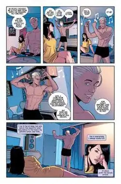 Andrew Wheeler of ComicsAlliance referred to Noh-Varr as "Marvel's first male pin-up."[73] Lauren Davis of Gizmodo called Noh-Varr one of the "male superheroes who truly are sexualized the way women are in comics," saying, "Now this is a great example of a character being portrayed as sexy in a fun and sweet way that doesn't overwhelm the scene. In Kieron Gillen and Jamie McKelvie's Young Avengers #1, we see Kate Bishop watching Noh-Varr dance in her room. It's her gaze that's on him, and some readers can appreciate Noh-Varr in the same way that Kate does, but at the same time, it's a nice character moment. And it's much sexier than running one's hands down an unwilling Batman's chest."[7] Afreen Khan of Sportskeeda dubbed Noh-Varr as an "outright sex symbol," stating, "Noh-Varr, in simpler terms, is a hunk. He is a part of the Marvels and goes by many aliases. The most popular ones are Marvel Boy and Protector. The superhero was introduced in the self-titled 2000 comic. As one of the many younger superheroes, he was also a part of the Young Avengers. [...] That’s not all. One of the main reasons the post about Park Seo-joon reprising Noh-Varr has gained so much attention is because of the hero’s sexual orientation. The Young Avenger is canonically bisexual, or pansexual. [...] Social media was bombarded with excited fans' reactions after the Twitter account of Marvel Updates posted that the actor would be playing Noh-Varr. A major reason for it is that the queer superhero is one of the few comic characters who was explicitly portrayed as a s*x symbol, in a good way. "[6] Benjamin Riley of Special Broadcasting Service described Noh-Varr was one of the "queer superheroes who changed the face of comics," asserting, "This one’s cheating a bit—Marvel Boy’s status as a queer character is debatable, but aside from being one of the hottest male superheroes in recent memory, the alien Noh-Varr (his real name) certainly has a queer sensibility. He’s also another Young Avengers alum—Marvel Boy’s teammate and sometime girlfriend Kate Bishop jokes at one point that she’s the only "straightie" on the team. What makes Marvel Boy queer isn’t just his sexuality (he implies his race doesn’t have sexual identities, only sexual acts) it’s how the comic treats him, visually: in a medium dominated by the male gaze, he’s not only sexy, he’s sexualized."[74]
