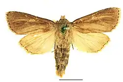 "The fore wings of this species (Plate 144. Fig 5), usually of a pale whity-brown colour, in some specimens are reddish tinged; or they may be almost uniformly reddish brown or blackish (var. fraterna Treit.). The row of black spots on the outer area are wedge-shaped and are placed just before the margin. The caterpillar is pale ochreous more or less tinged with pink; a paler line along the spiracles; head and plate on first ring of the body red-brown. July to August, in stems of Typha. The moth flies in August and September, and although it may be netted when on the wing at dusk, or at light, it is obtained in better condition by rearing it from the chrysalis, which may be found in the stems (Plate 148, Fig. 3), those of the previous year for choice, of reed mace." South, 1907.[1]