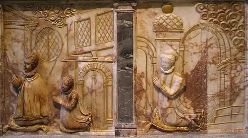 The palace was designed to be a celebration of the power and the grandeur of the Tudor dynasty, built to rival Francis I's Château de Chambord.[1] Unlike most of Henry's palaces, Nonsuch was not an adaptation of an old building; he chose to build a new palace in this location because it was near to one of his main hunting grounds. However, the choice of location was unwise, for there was no nearby supply of water suitable for domestic use.[2]