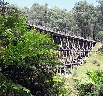 After closure, the tracks and station buildings along the line were dismantled and many sections of the right of way were sold off. The Buln Buln Shire Council purchased the No. 7 Noojee trestle bridge from Victorian Railways for the nominal sum of £1 ($2).[22] This historic eighteen-span structure, 102 m (335 ft) long and 20 m (66 ft) high, was one of three rebuilt in 1939 after the original structures were razed by the Black Friday bushfires. Architecturally significant as the tallest surviving timber trestle bridge in Victoria and a unique and intact example of trestle bridge construction, it is now registered with the National Trust of Australia.[24]